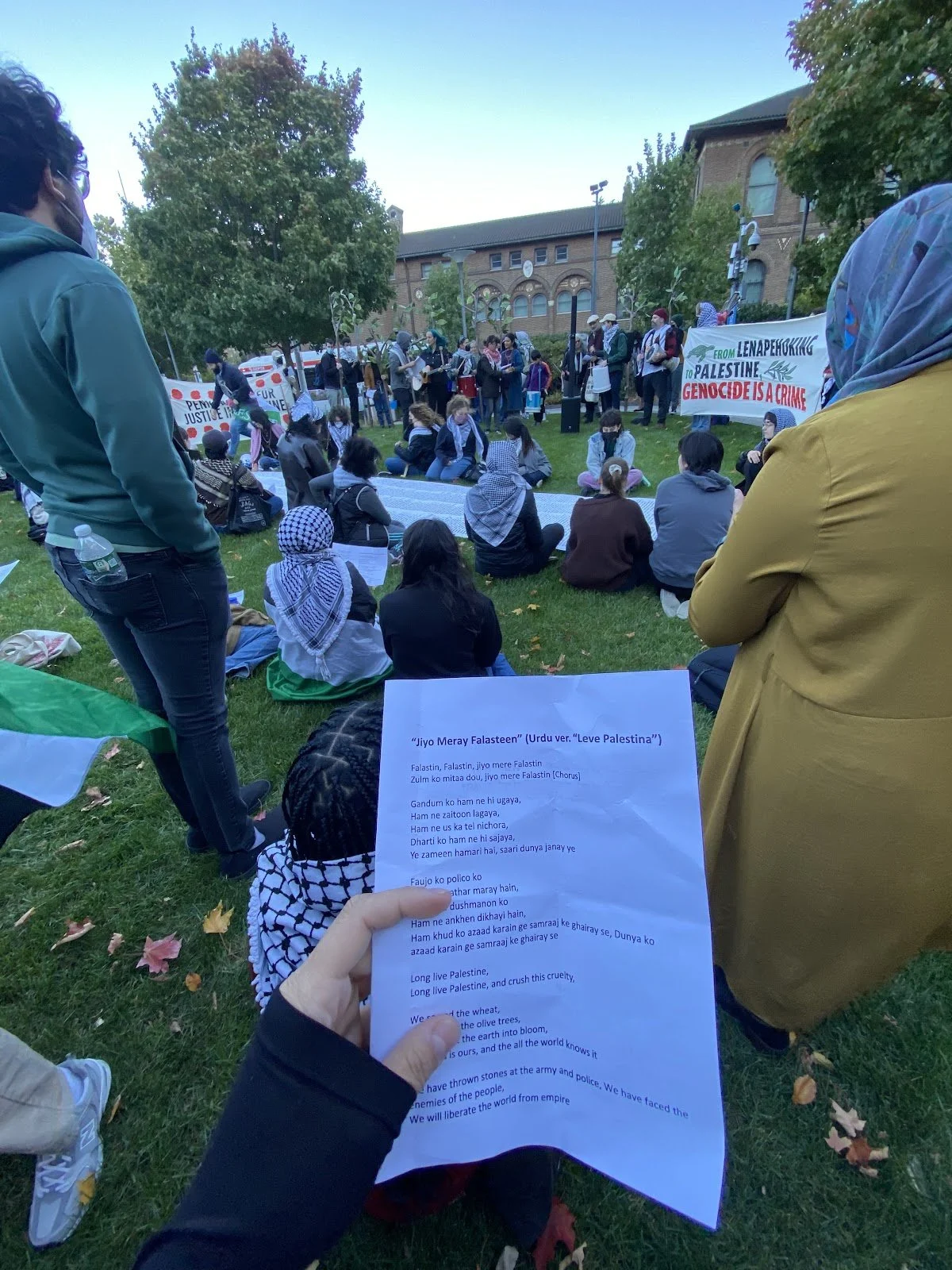 4PMish: I made my way, late as usual, to the UPenn campus to the Palestine solidarity vigil organized by faculty members. My friend Samiha and I had planned to cook a Palestinian inspired dinner later that night and decided to meet at the vigil. Their phone had 4% battery so we were hoping to find each other amongst the crowd and we did thankfully. My body still hurts from a fall I took last week so my legs and knees got tired fast today. West Philly is so hill-ey especially going up Walnut St. To me it feels like winter already, it was super windy. It always feels especially windy at university campuses because of all the tall buildings/ wind tunnels.