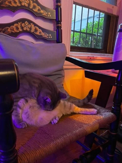 Bingus chews on his belly while I tidy the living room and prepare a cheese plate. I'm waiting for Emily to come while sitting with the suspicion that we had a miscommunication about when she'd come over for movie night. I'm making a bad habit of not speaking my mind the first time when we texted about this days ago. At least I say something now, and she's coming at 5:30 instead of 7:00. And she brought two bottles of wine. We watch Inside Out 2. We laugh and gab and I tear up a little (shocking). Vivian is able to come for a little bit too and she, as always, makes insights that make me gasp with laughter.